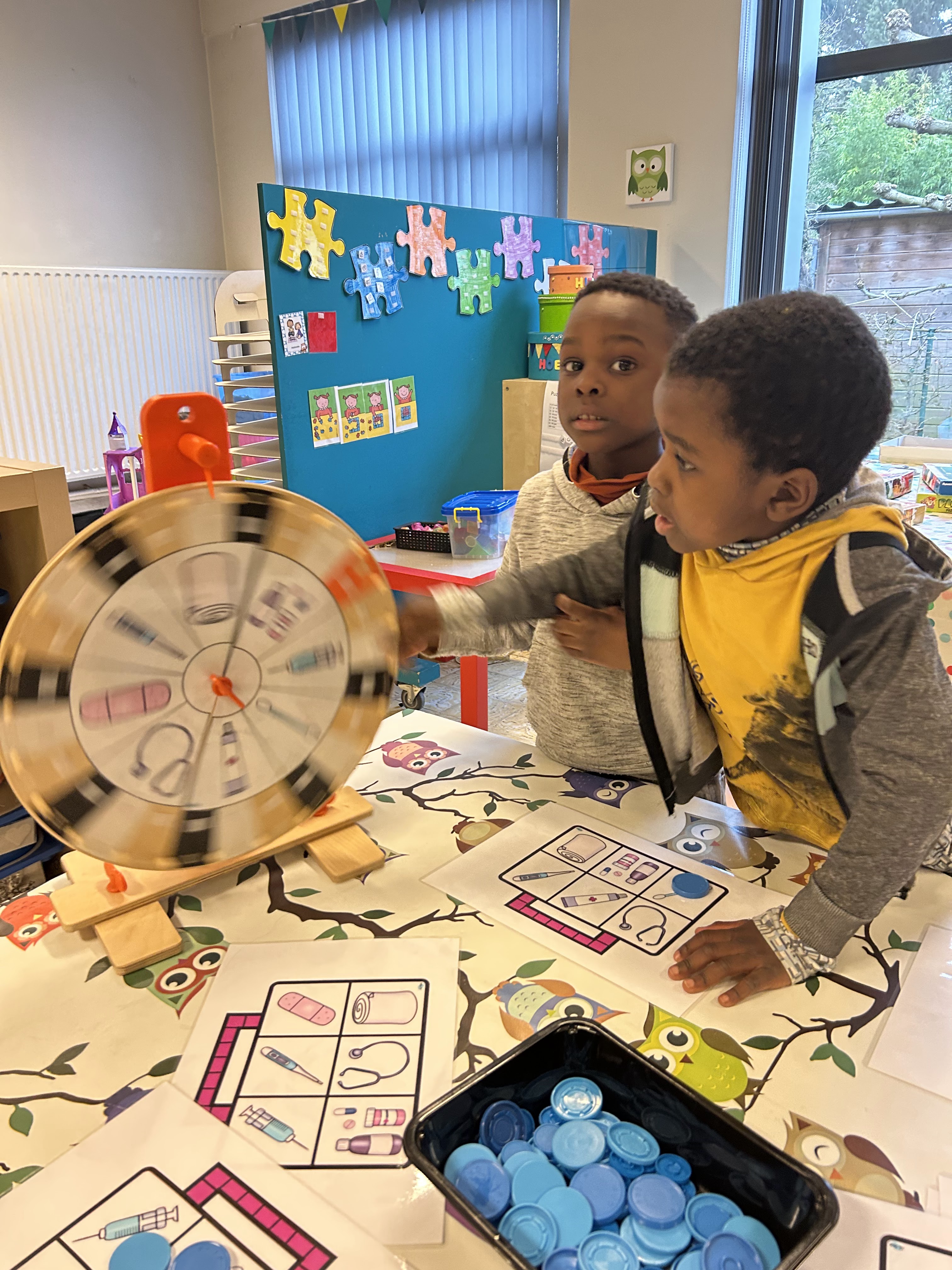 Lasse voelt zich niet goed en is bedekt met rode stippen, maar gelukkig kunnen de kleuters de situatie oplossen dankzij hun kennis over de dokter. In de klas vonden heel wat onderzoeken plaats in de dokterspraktijk en konden wij medicijnen kopen in onze apotheek.